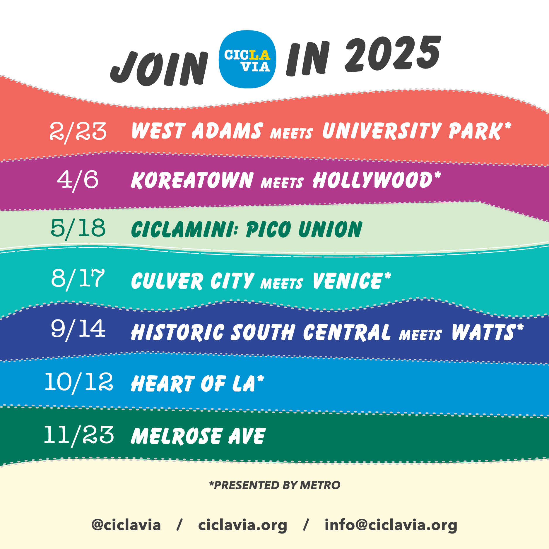 🎉 The entire 2025 CicLAvia Sunday schedule is here! CicLAvia Sundays will continue to support community connections in the coming year.
